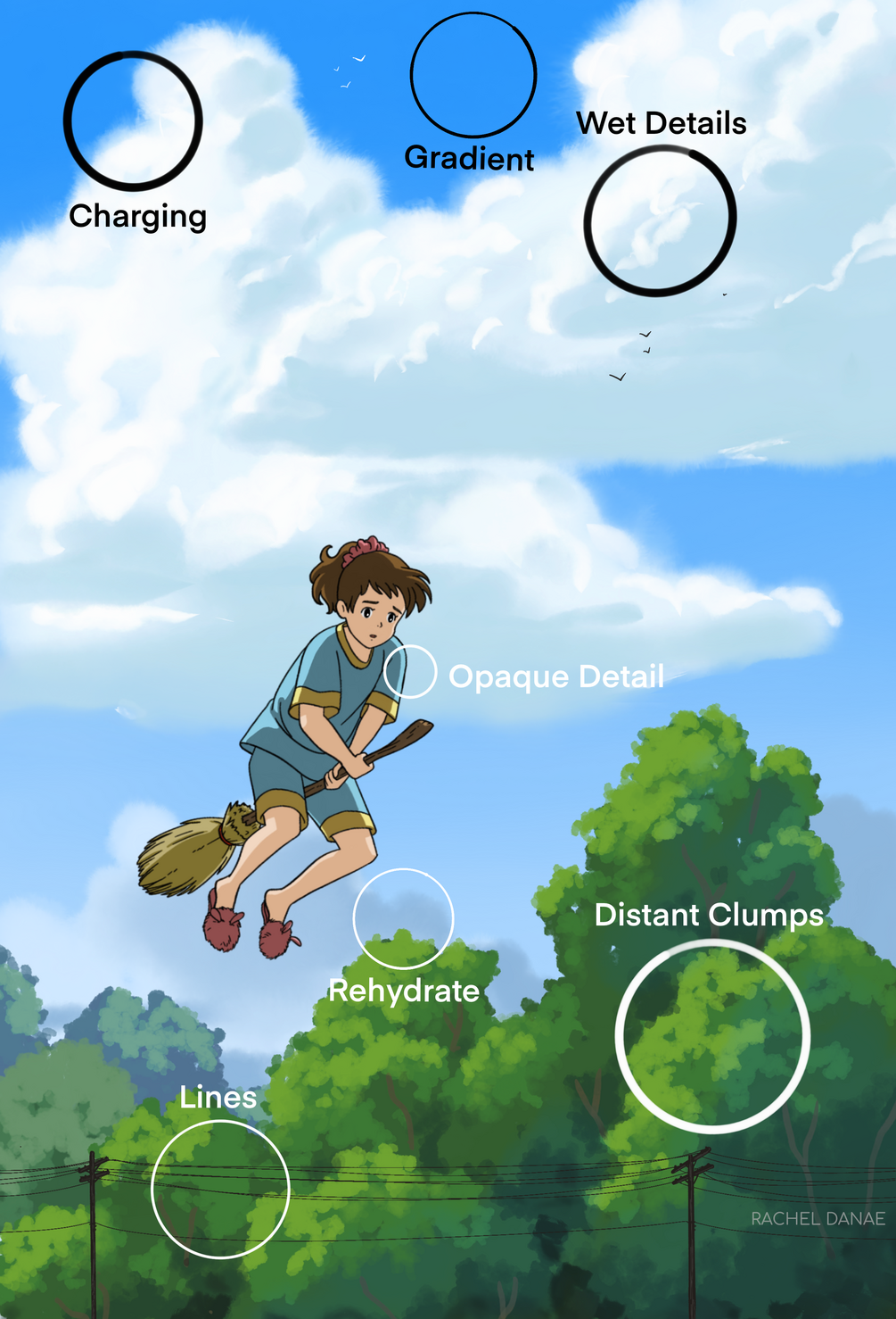 My assistant and I analyzed our favorite gouache paintings, noted the characteristics that we wanted to replicate the most, scanned in brush strokes and textures, and started experimenting, testing, and retesting.