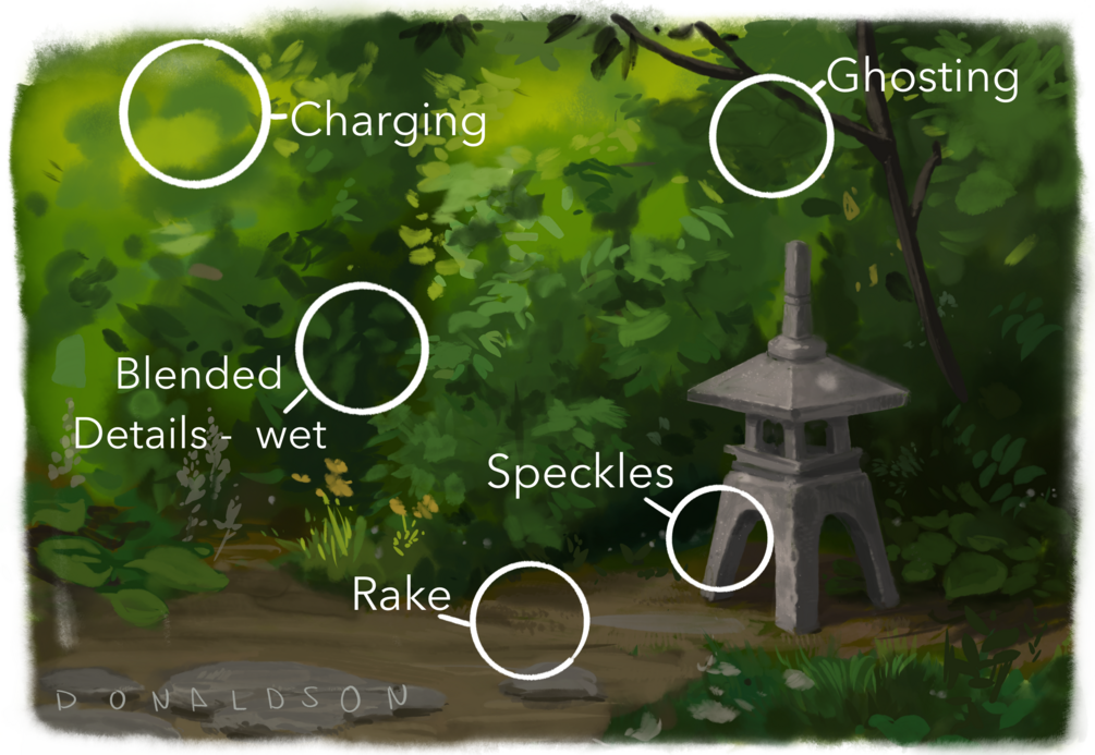 My assistant and I analyzed our favorite gouache paintings, noted the characteristics that we wanted to replicate the most, scanned in brush strokes and textures, and started experimenting, testing, and retesting.